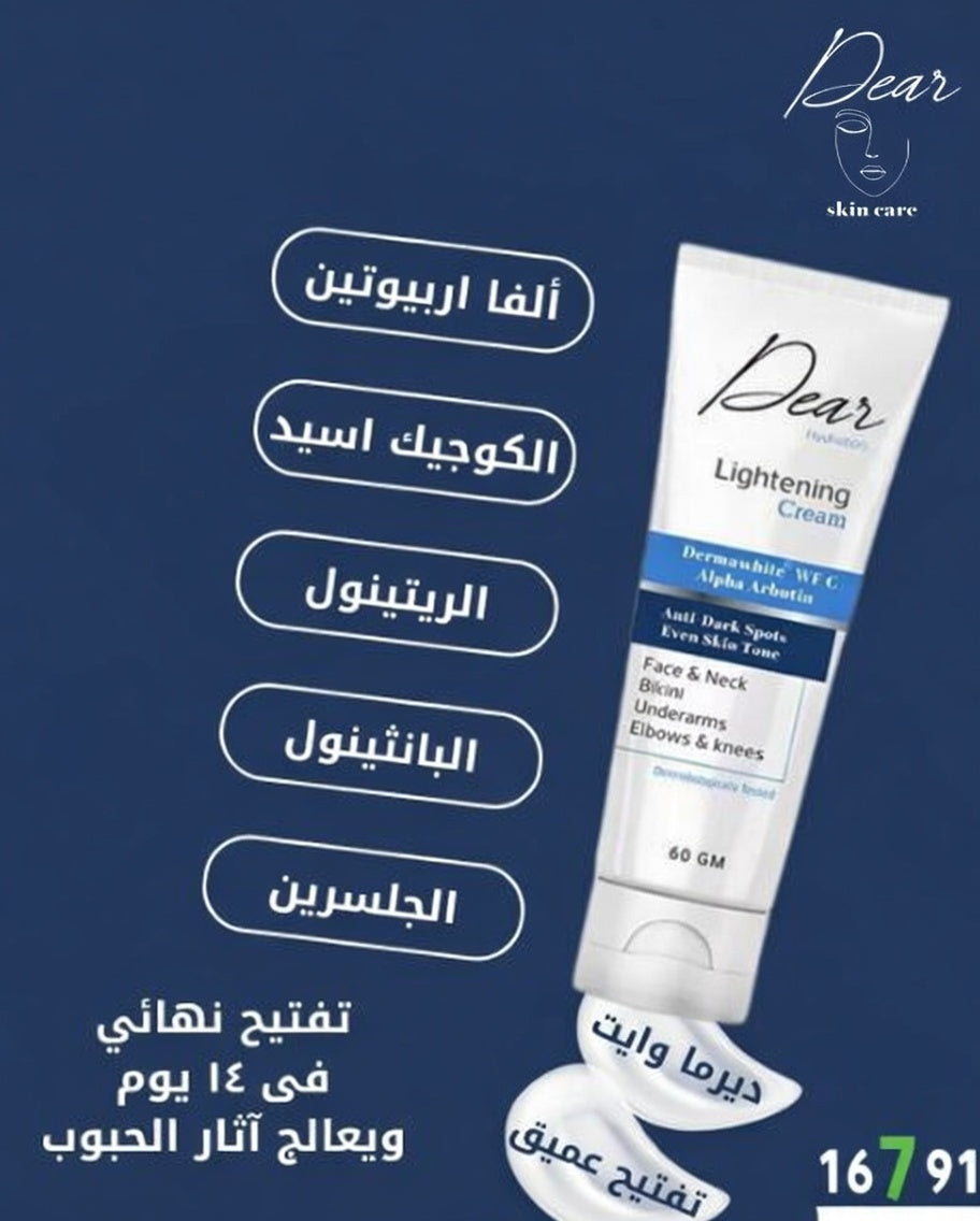 تخيلي الاستيقاظ ببشرة مشرقة ومتألقة بفضل كريم دير لتفتيح البشرة. هذه التركيبة الفريدة من المكونات الطبيعية مصممة خصيصًا لتفتيح وتوحيد لون البشرة، مما يمنحكِ مظهرًا أكثر نعومة وشبابًا. كريمنا مثالي للاستخدام اليومي، كما أنه مناسب للبشرة الحساسة ولا يسد المسام، مما يجعله سهل الإضافة إلى روتين العناية بالبشرة. ودّعي البشرة الباهتة والمتعبة، واستقبلي بشرة أكثر إشراقًا ونضارة.